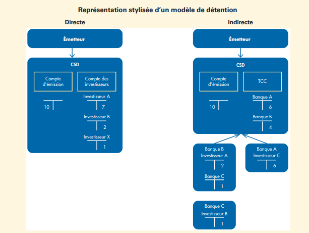 Les CSD assurent la connexion entre les émetteurs et les investisseurs, mais la conception actuelle des CSD occulte le lien avec les bénéficiaires effectifs. En théorie, il existe deux modèles de détention des titres (Graphique 1). Dans un système de détention directe, un CSD ouvre des comptes ségrégués au nom de chaque investisseur de manière individuelle. En revanche, dans un système de détention indirecte, un CSD ouvre des comptes omnibus au nom d’un participant (dépositaire, courtier, etc.), lequel répartit ensuite les titres entre ses clients dans ses registres internes. Les principales économies de l’UE – la France, l’Allemagne, l’Italie et l’Espagne – ont recours au modèle des comptes omnibus. En revanche, beaucoup de pays plus modestes sur le plan économique – dont la Suède, la Finlande, la Norvège – imposent une ségrégation totale aux investisseurs nationaux (notamment pour les actions).