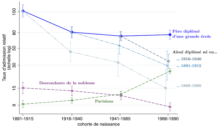 L’étude s’intéresse par ailleurs à la reproduction sociale entre générations de diplômés des grandes écoles. Les enfants de diplômés nés entre 1891 et 1915 avaient 154 fois plus de chances d’être admis dans ces prestigieuses écoles. Cet avantage est divisé par deux pour la génération suivante et reste ensuite stable avec environ 80 fois plus de chances d’admission pour un enfant de diplômé né entre 1916 et 1995.