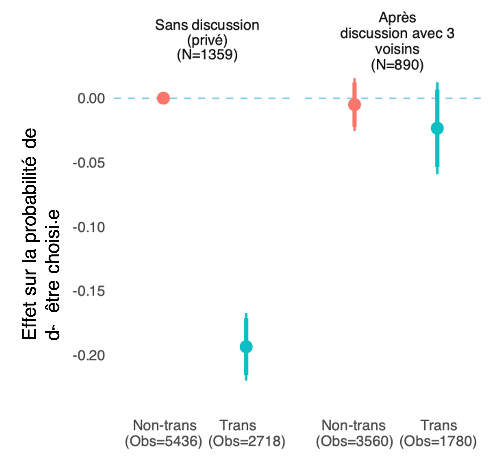 Lecture: L’axe vertical mesure l’effet différentiel sur la probabilité de choisir un travailleur trans plutôt que non-trans, d’une discussion avec ses voisins par rapport à une décision sans discussion. Les points mesurent l’effet moyen sur chaque probabilité, et les barres verticales représentent les intervalles de confiance à 90% et 95%.
