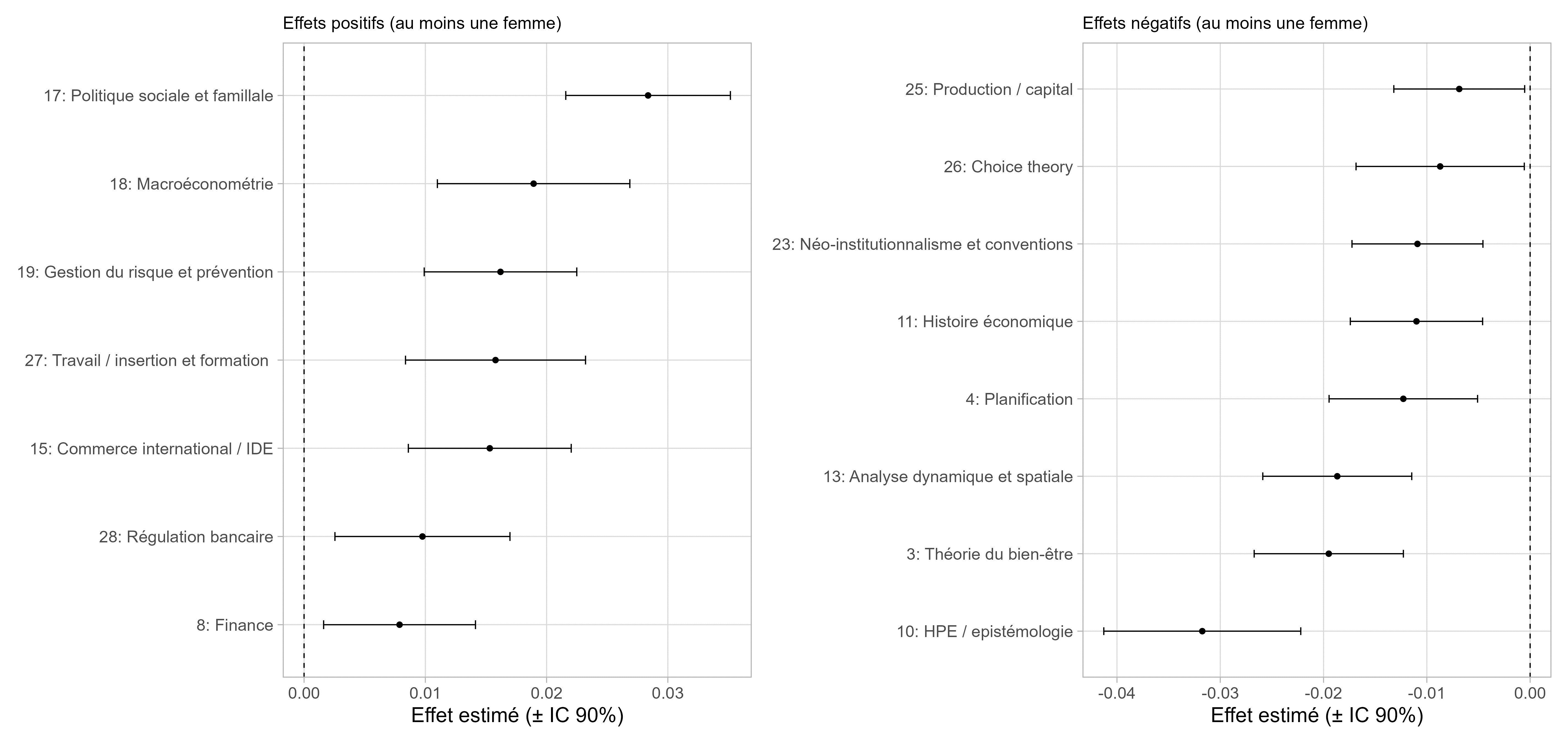 L’un des intérêts de notre modèle est de permettre d’examiner l’effet du genre sur le contenu des articles. En intégrant une variable indiquant la présence d’au moins une femme parmi les coauteurs, nous mesurons son influence sur la prévalence attendue de chaque thématique. Les résultats montrent que cette présence est systématiquement associée à des thématiques appliquées : politiques sociales et familiales, gestion du risque, travail et insertion, régulation bancaire, mais aussi macroéconométrie, finance ou commerce international. Cela ne correspond pas seulement aux domaines historiquement investis par les femmes, mais s’étend à un ensemble large de thématiques empiriques. À l’inverse, les thématiques dominées par les auteurs masculins relèvent plus souvent de la théorie économique, que cette dernière soit mathématisée ou non (figure 3).