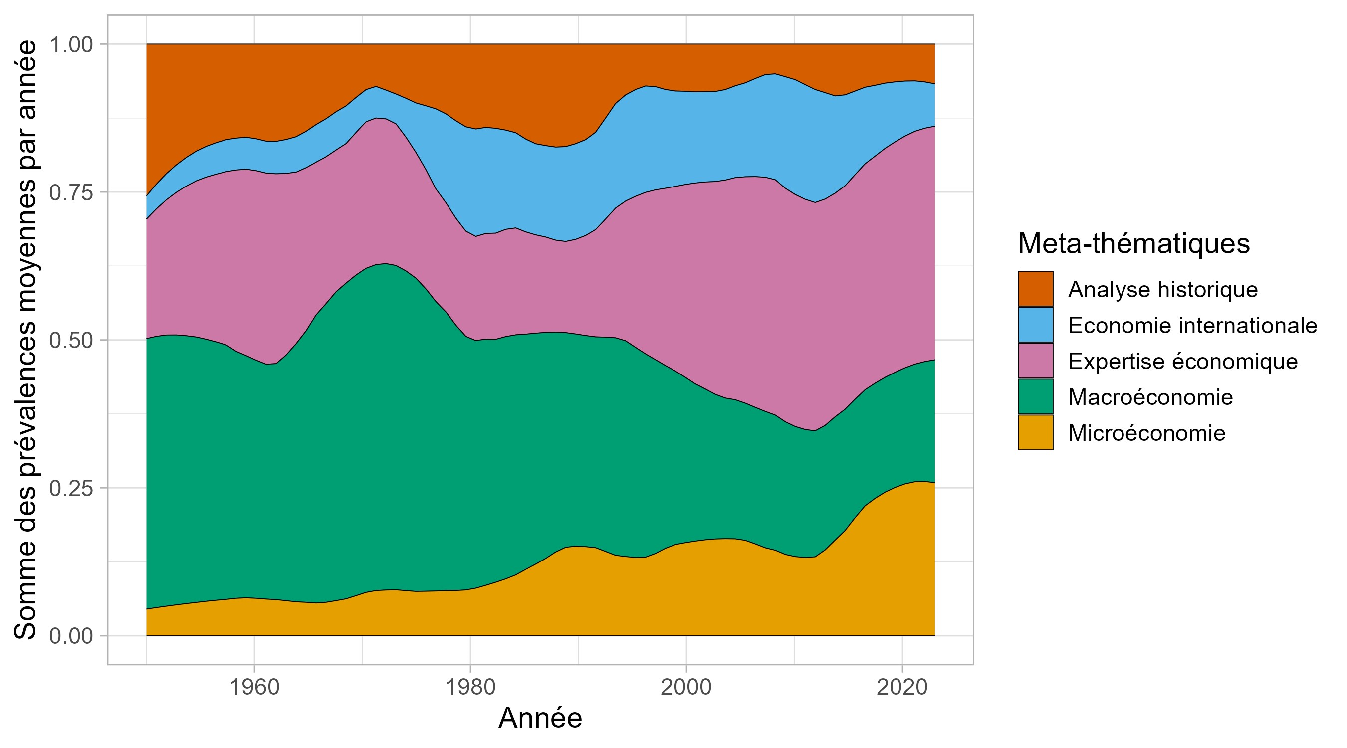 Enfin, la métathématique « Analyse historique » décroît continûment au cours des deux dernières décennies, tandis que la Microéconomie gagne en importance. Ce mouvement met en évidence l’évolution du discours des économistes vers des approches plus analytiques et formalisées.