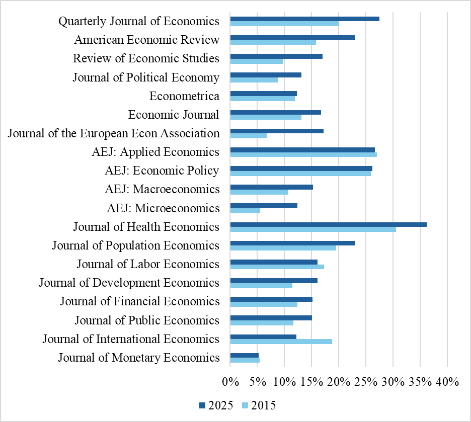 Source : Articles répertoriés sur RePEc pour chaque revue (le sexe de chaque auteur est déterminé par Claude.AI avant vérification humaine du codage, mais des erreurs peuvent persister)