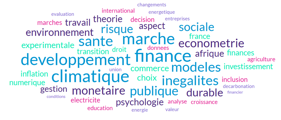 Pour anticiper les évolutions de la représentation des femmes en sciences économiques en France, il est utile d’analyser les thématiques choisies par les doctorantes et doctorants. Selon les données de Theses.fr, les femmes représentaient seulement 35 % des 152 thèses soutenues en sciences économiques en 2025, ce qui laisse présager que des progrès importants restent à accomplir (pour plus de détail sur la part de femmes depuis le Master jusqu’aux postes de professeur des universités et de directeurs de recherche CNRS, voir l’état des lieux rédigé par le comité AFSE-WinE en mai 2025).