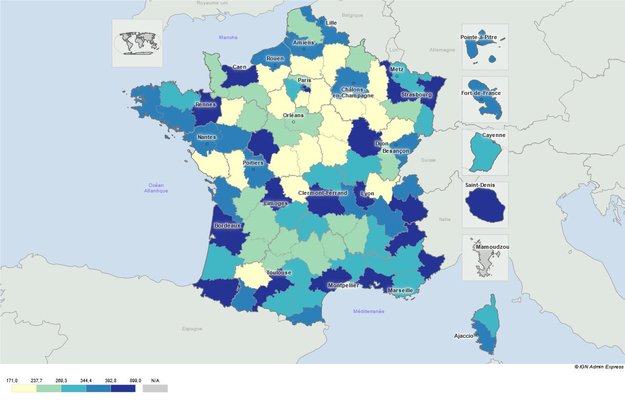Carte 1 : Densités départementales des médecins en activité au 1er janvier 2025 (pour 100 000 habitants) (Conseil national de l’ordre des médecins, 2025)